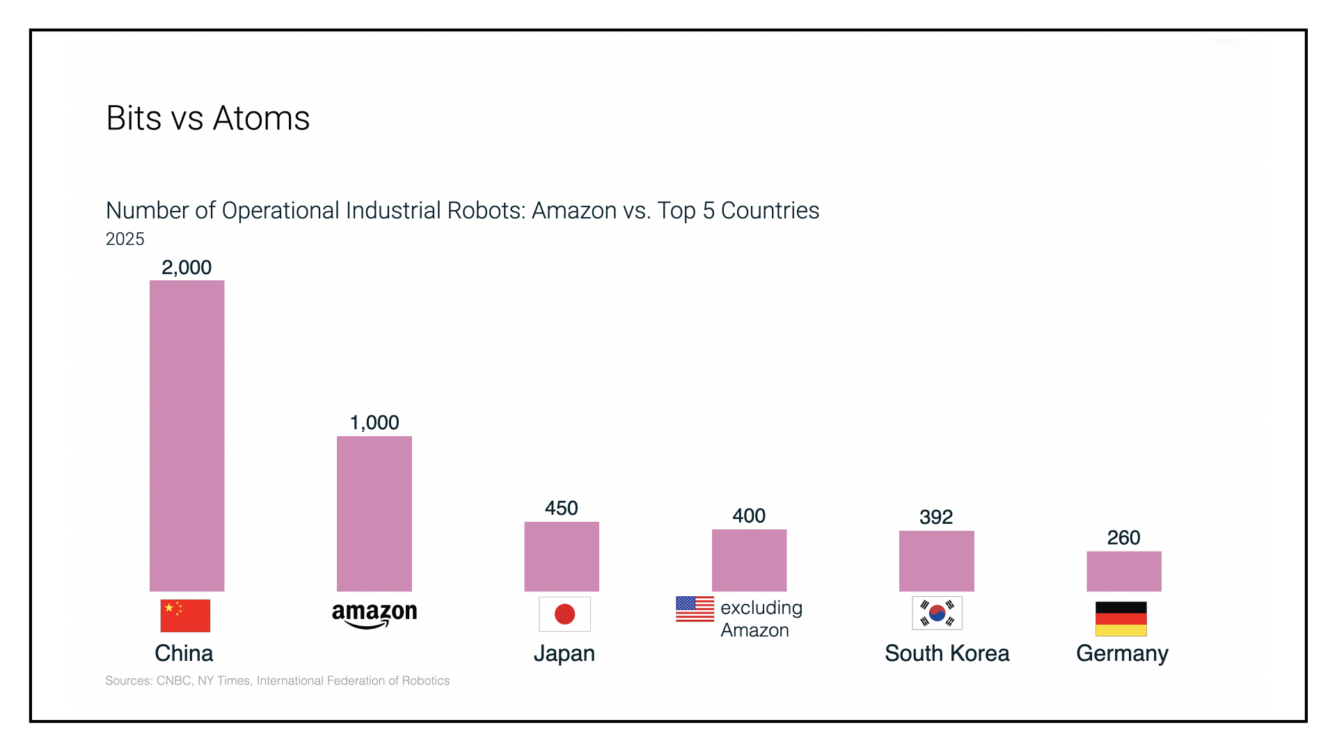 I’m bullish on Amazon, even though it underperformed the Mag 7 this year. The collision of AI and robotics is the Champagne and cocaine cocktail fueling Amazon’s retail margin expansion, catalyzing a 2x increase in the gross merchandise value of its largest business (retail) by 2033, without adding any human workers. Just as Ford’s assembly line slashed automotive production time by 88%, Amazon’s robotics investments have reduced the time from click to ship by 78%. The rest of the Mag 7 capitalizes on the elevation of information (bits) over objects (atoms), while Amazon is leveraging bits to move atoms faster and cheaper. Notably, the market hasn’t priced this in yet; in 2025 Amazon stock traded at a P/E ratio of 33, compared to its historic average of 58. The greatest accretion in shareholder value from AI will be at companies that leverage others’ AI. Specifically, Amazon.