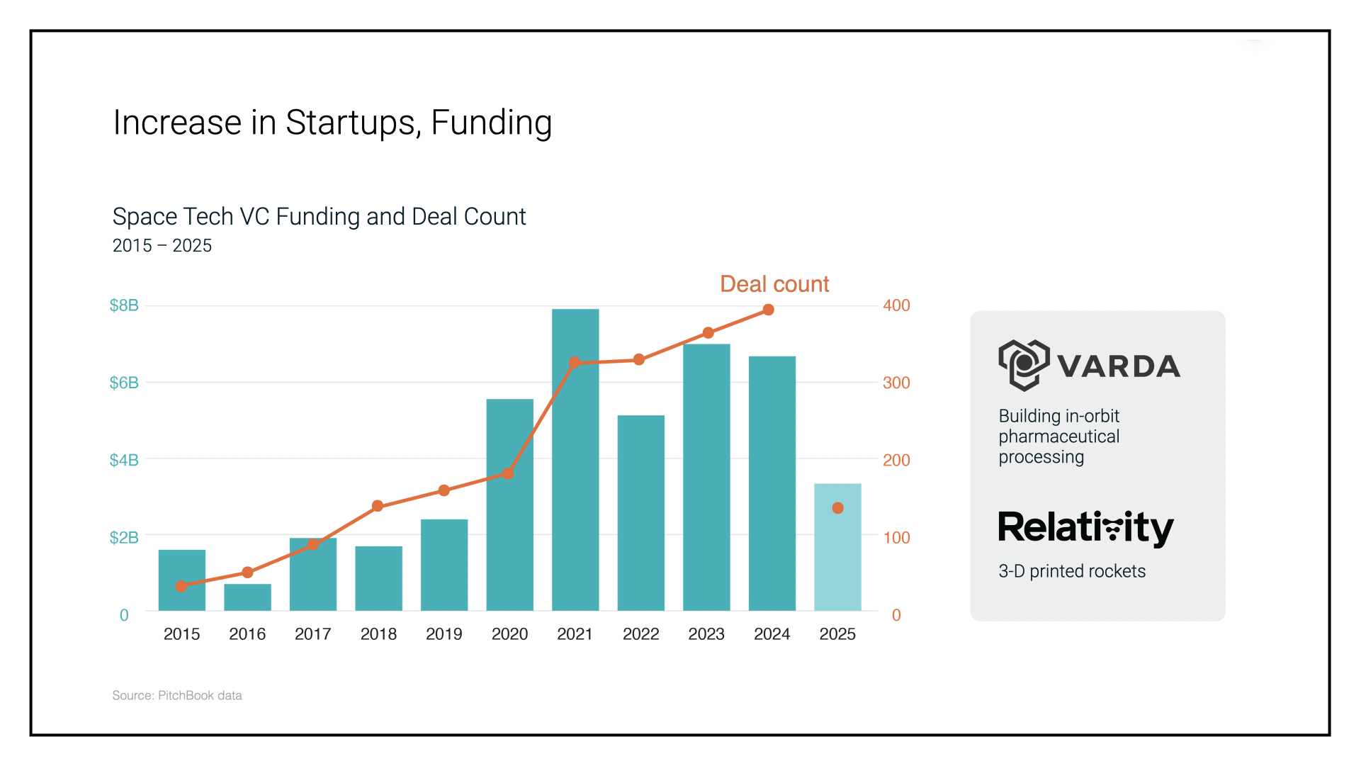 When technology gets cheaper, startups form, the ecosystem attracts cheaper and cheaper capital, which spurs innovation, and so on and so on. The cost of the personal computer decreased 58% during the 15-year dot-com boom, and U.S. IT spending increased 200%. The same pattern is happening now with AI: The cost of GPU operations has fallen by 74%, while global AI funding has risen by 280%. The key metric for space? Over the past 15 years, the cost to get a kilogram of payload into orbit is down 89%, while private U.S. space investment jumped 6x.