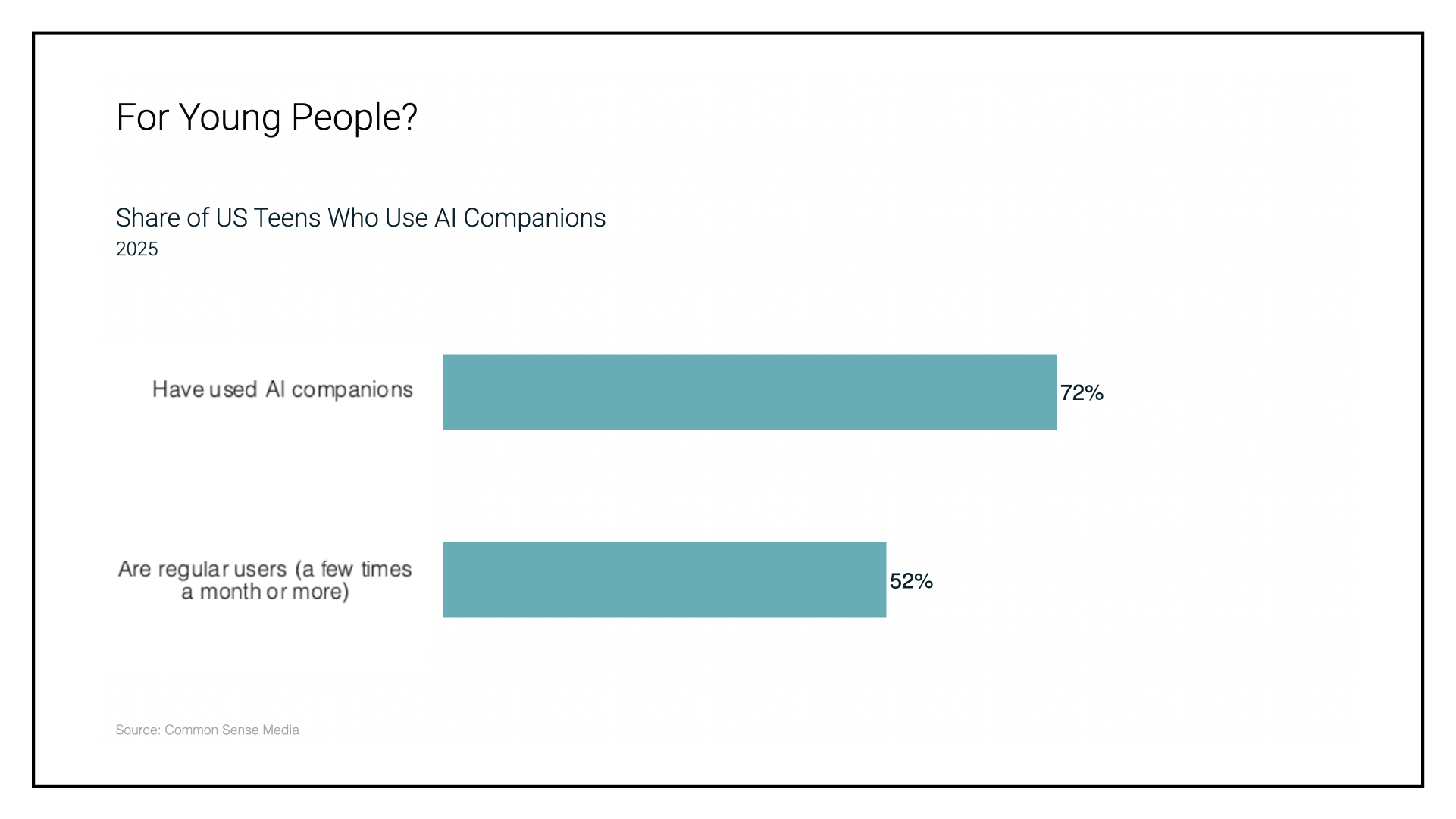 I believe synthetic companions are the next opioid crisis for young people. On Character.ai, 79% of the users are under 35; the average session is 93 minutes. In any given week on ChatGPT, 560,000 people show signs of mania or psychosis, while 1.2 million people engage in conversations that indicate they have a plan to self-harm. Unfortunately, Congress is The Walking Dead meets The Golden Girls. They see the danger from synthetic relationships about as clearly as the propaganda threat posed by TikTok.