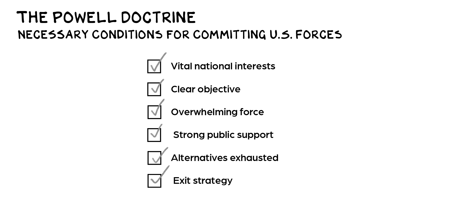 In response to Iraq invading Kuwait, George H.W. Bush assembled a 42-nation coalition. After a six-month build up, it took 43 days and fewer than 300 U.S. killed for the American-led forces to expel Iraq from Kuwait. Bush decided to declare victory and leave, vs. attempting to invade Iraq and topple Saddam Hussein’s regime. The first Gulf War was Goldfinger: There was an iconic villain (Saddam), clear stakes (oil and sovereignty), spectacular set pieces (smart bombs down ventilation shafts), public support (yellow ribbons), and a clear ending. Even the dialogue was Oscar-worthy: “This aggression will not stand.” The plot was a perfect execution of the Powell Doctrine.