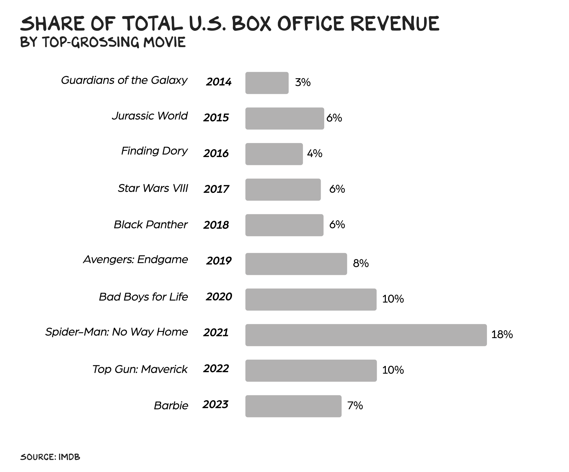 Of that $9 billion, Greta Gerwig and Christopher Nolan accounted for 10%. Barbenheimer’s success has been widely recognized as the saving grace of Hollywood, scooping up 17 nominations and seven awards at the Golden Globes. People think this is a good thing. In reality, the industry is becoming more concentrated as the big-budget, high-production-value projects collect an increasingly greater share of dollars and the rest of Hollywood is left behind. In 2003 the highest-grossing movie (Finding Nemo) made up 3.5% of domestic box office revenue — this year that number doubled, to 7%. Put another way, movie inequality is mimicking income inequality … getting worse.
