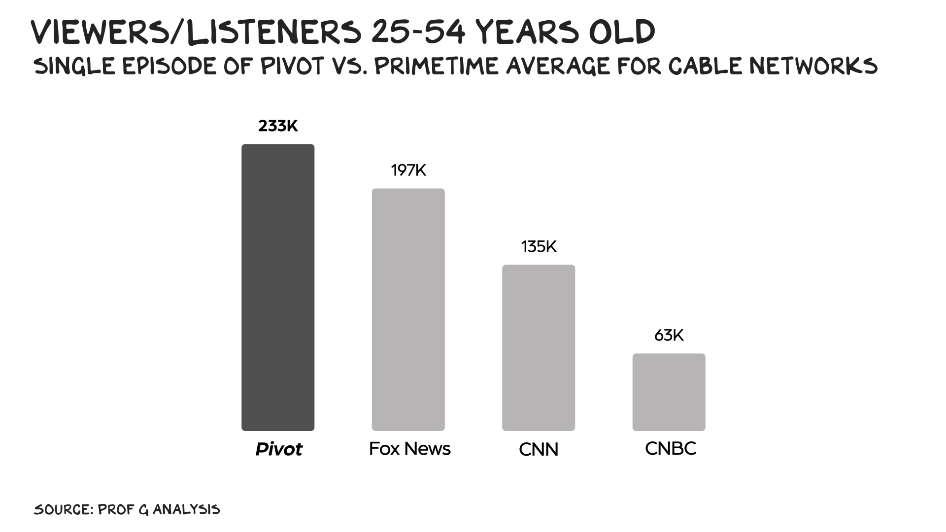That’s aligned with the trends we’re seeing on Pivot. Data show that among the core demographic — adults between 25 and 54 — Pivot has a bigger audience than Fox News, CNN, or CNBC. While we trail Fox and CNN in overall audience size, those who tune in to Pivot have a much higher median income.