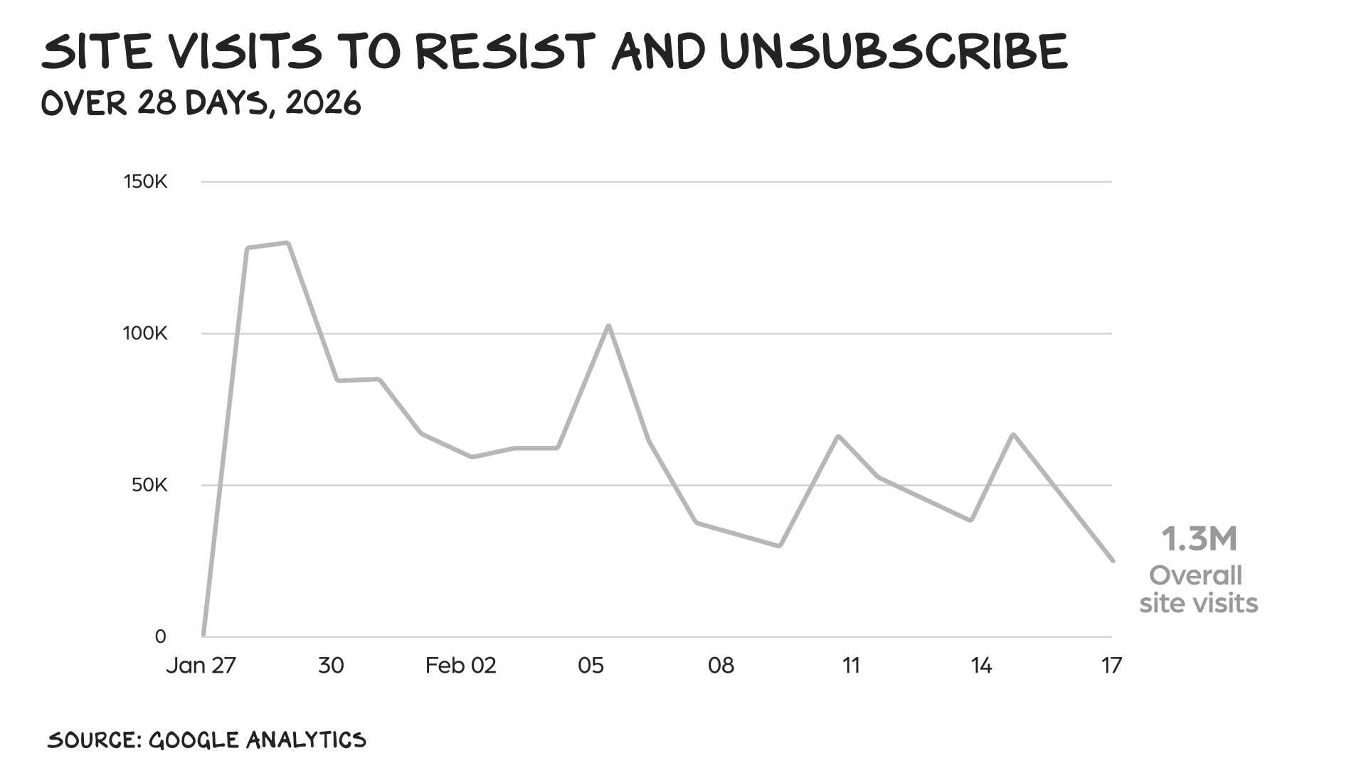 After launching Resist and Unsubscribe, I needed to build awareness and turned to broadcast media. Since Feb. 1, I’ve hit every corner of the map, from Amanpour and Anderson Cooper to the Bulwark and MS Now. Our goal is to counter Trump’s assault on American values by zeroing in on what he really cares about: the markets. We’re asking people to join an economic strike targeting Big Tech and companies enabling ICE. If we succeed in turning even a small number of them into unsubscribers, that could translate into a sizable decline in subscription growth (mother’s milk to the tech companies) and market value. Only then will CEOs who’ve enabled the president push back … or at least get off their knees.