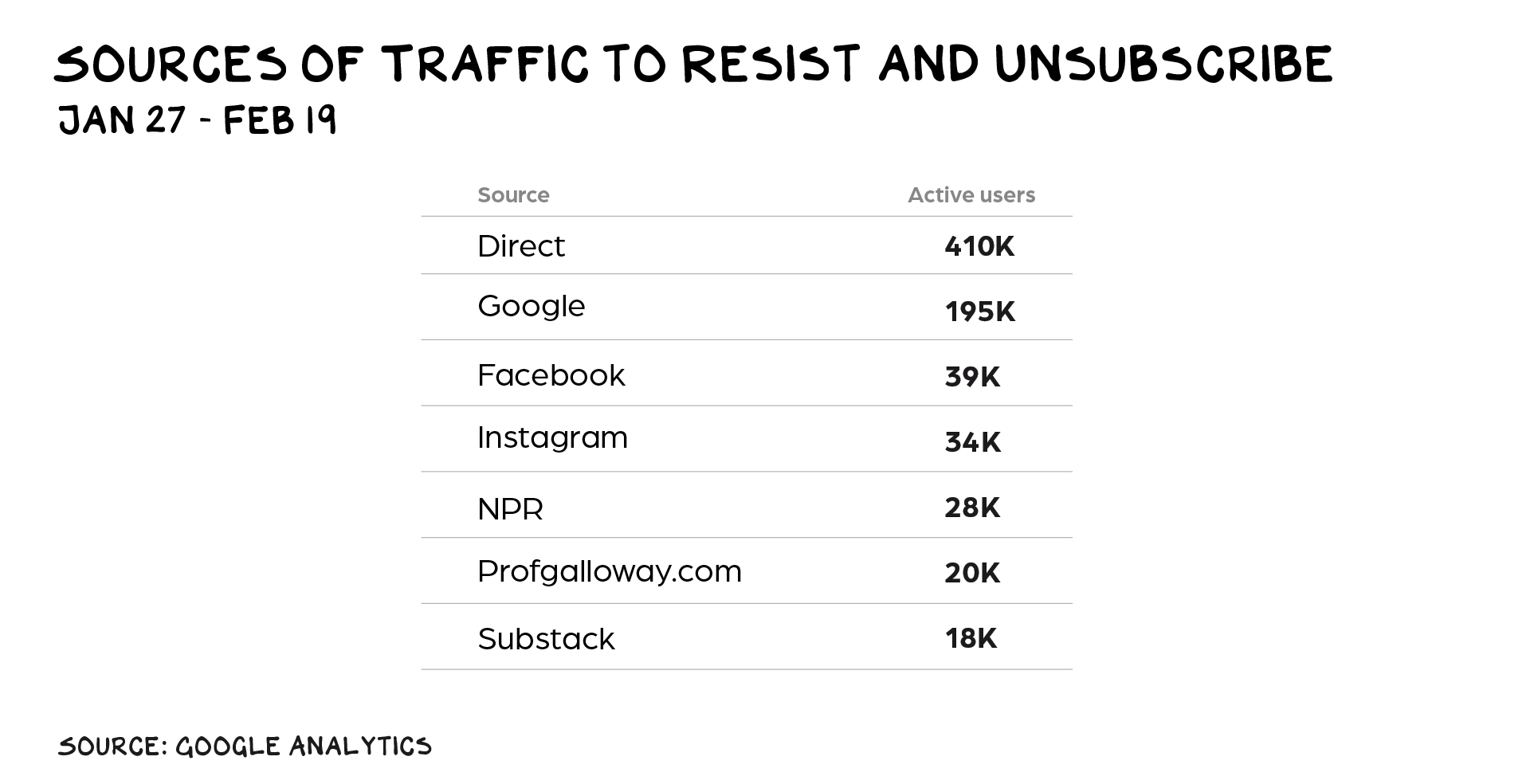 The major media outlets have given us a bump, but the buzz is proving hard to sustain. We knew we needed other voices, providing third-party credibility, to maintain the energy. We’ve received mentions from current and former elected representatives (AOC and Adam Kinzinger), but we live in a celebrity nation. Chelsea Handler, who contacted me after hearing about Resist and Unsubscribe, posted a video earlier this month focusing on the platforms she’s unsubscribed from. The video garnered more than 128,000 likes and inspired more than 6,000 visits, almost a fifth of the 34,000 users who’ve migrated from Instagram to our site. Applying the same math, that’s more than $100,000 of lost revenue and $1 million in market value. From just one post.